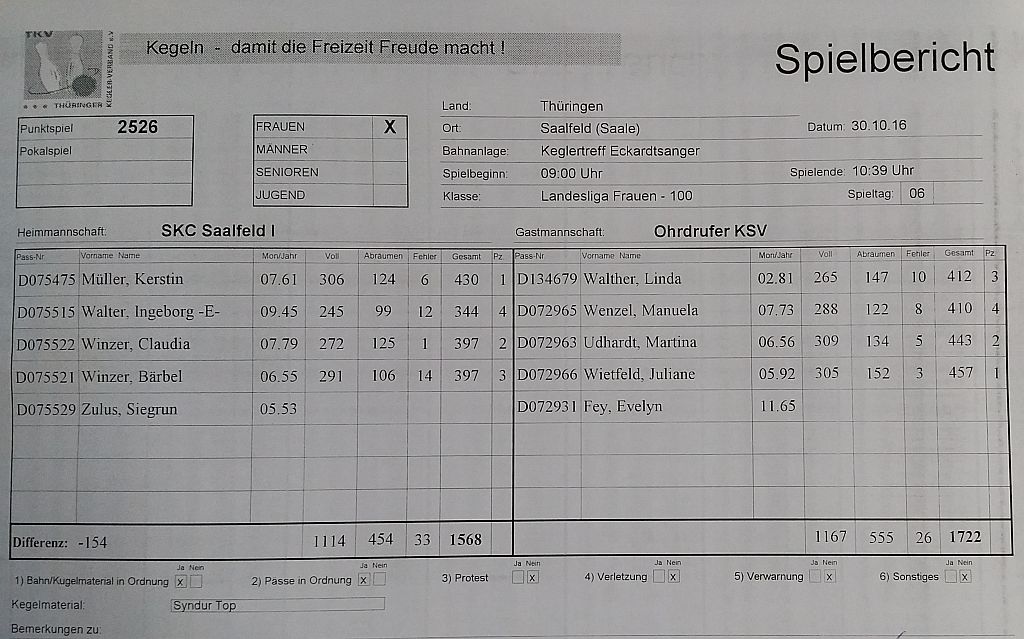 SKC Saalfeld - Ohrdrufer KSV | 1568:1722 Kegel Spielbericht |