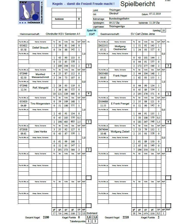 Ohrdrufer KSV - SV Carl Zeiss Jena | 3:3 MP, 2180:2218 Kegel Spielbericht |
